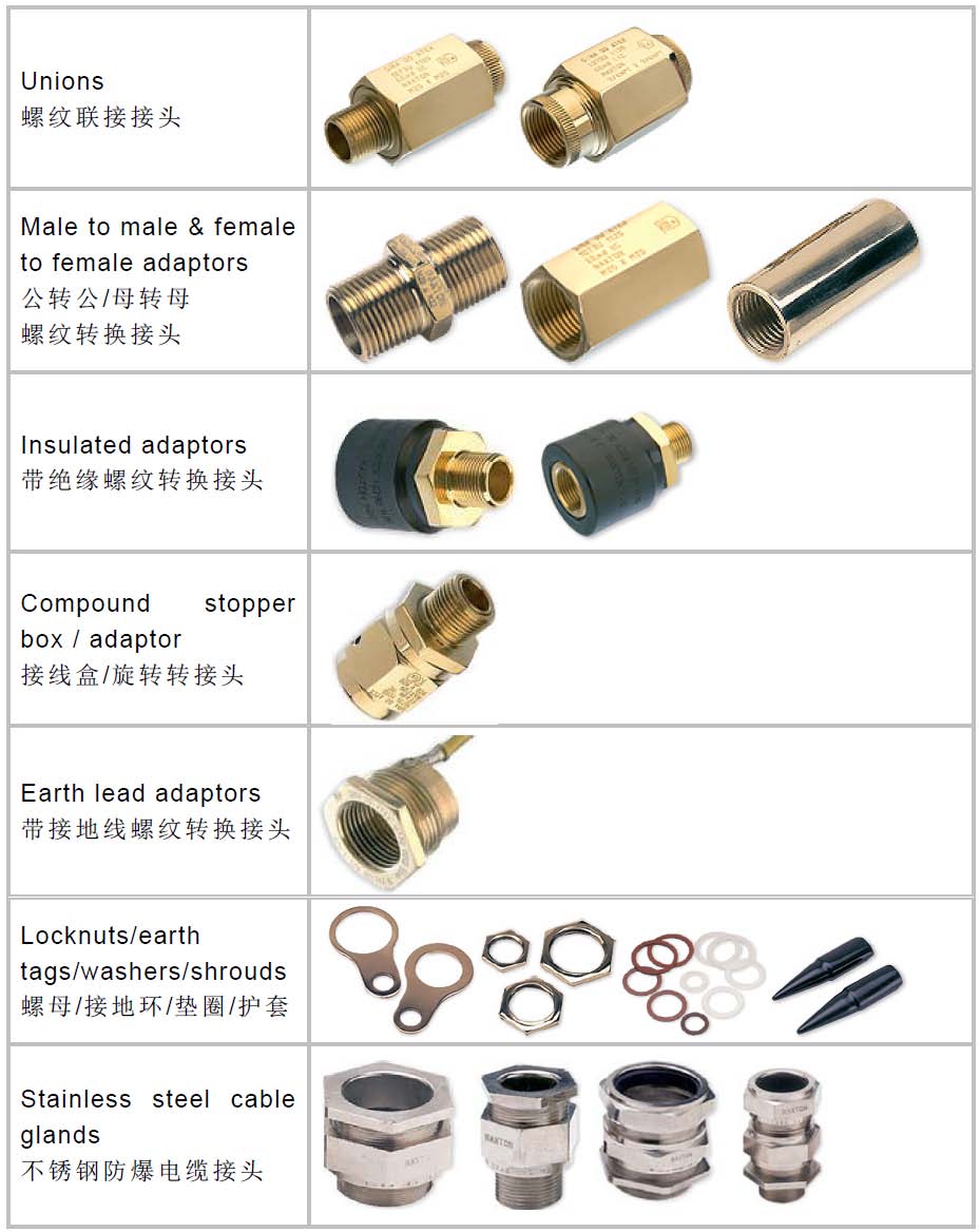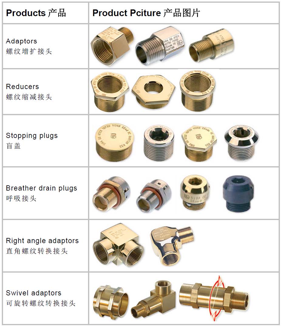 主要產(chǎn)品:防爆螺紋轉換接頭,如隔爆及增安型螺紋適配器、縮減器、絲堵、呼吸接頭及其它附件如螺母、接地圈、IP密封圈、鋸齒墊圈等。